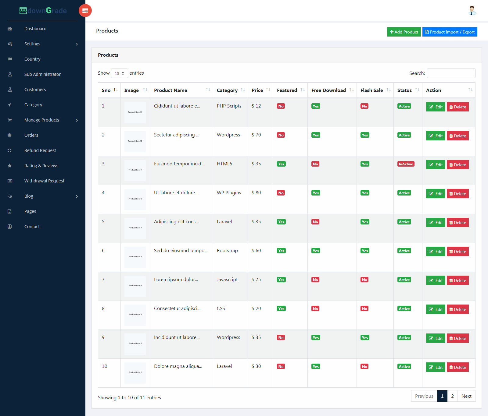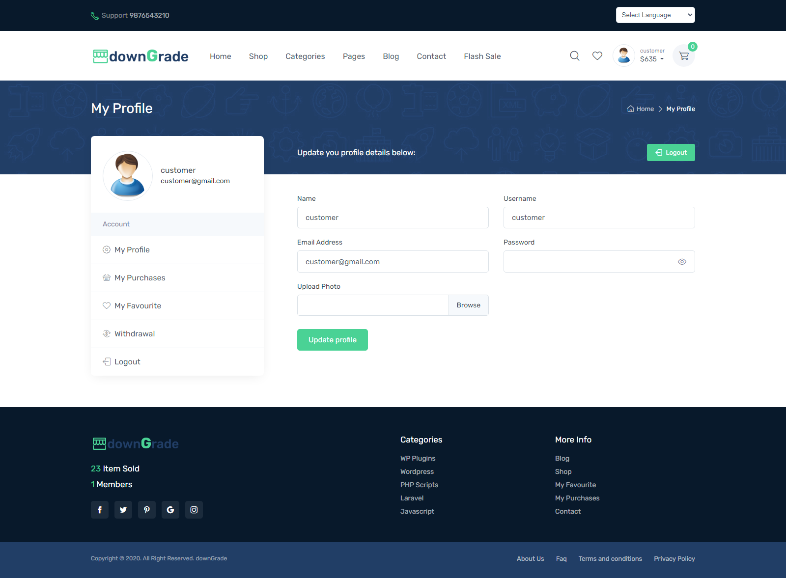 downGrade is single vendor digital products marketplace with support system.You can selling your items an online store to suitable marketplace. Suitable selling items are themes,plugin and scripts. Script Developed with PHP Laravel & Mysql and Bootstrap4 Support. There are many powerful features for user roles, flash deals, blog, payment gateways, social login & shares, multilanguage & recaptcha, import / export product, invoice generate, newsletter, guest checkout…ect we provide to help of details documentation it will take few minutes to quick installation.